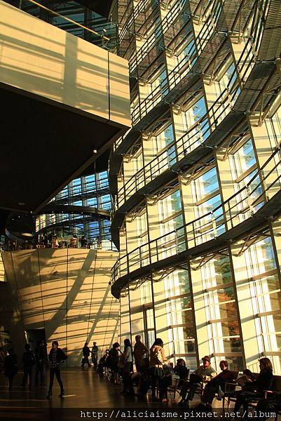 我喜歡一大早就前來,陽光透過玻璃帷幕,在館內演出不同層次的光影表情,與鄰近草木繁茂的公園林蔭氣韻相通,聲息相聞,而我似乎感覺到這股被喚起的新生契機,跟著大地、陽光一同呼吸。