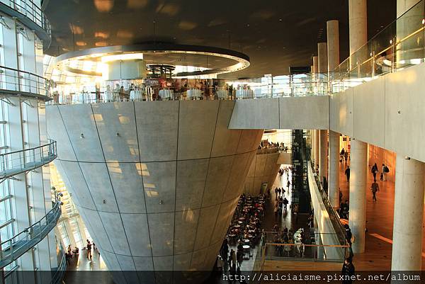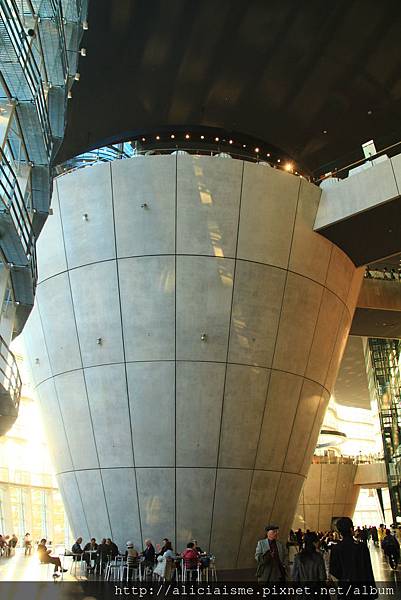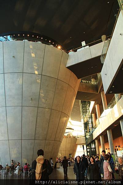 為了避免作品被陽光過度照射,展覽館設置在館內後方。寬敞的中庭內,一高一低、兩座巨型清水混凝土建材的杯狀形建築體,理直氣壯地佇立在其中,另類的趣味格調,絶佳採光與挑高空間的設計方式,讓逛累的訪客可在此歇息用餐、喝杯咖啡。