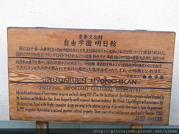 自由學園當年在羽仁夫婦以自由精神為前提下,於1921年建造了明日館,極簡風格的外觀下,洋溢著優美的內在思想。萊特也沿襲他擅長的「草原」想像,刻意壓低整棟建築物屋頂,而融入學園前方廣闊的草原及老樹。