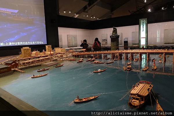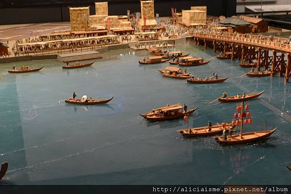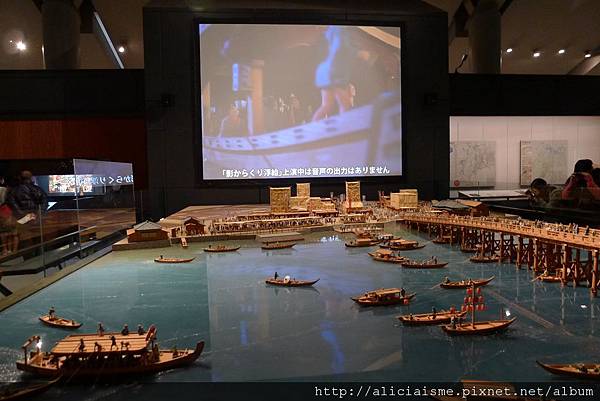 讓我最印象深刻的兩國橋,以1:30比例打造出當年下町庶民生活百態,橋上是熙來攘往的行人,橋下隅田川河水澄澈,水面上穿梭如流的船隻與忙於交易的商賈、漁夫,1500尊唯妙唯肖的人型偶,表情各異,再配合背後影音動態介紹,耳邊似乎聽見當年往來雜沓的熱鬧聲,為江戶文化寫下光輝燦爛這一頁,永存現今東京的記憶。