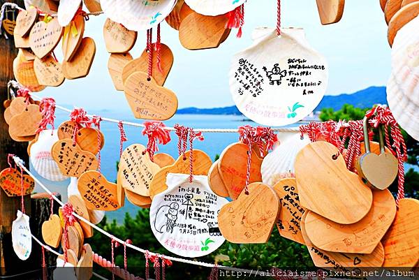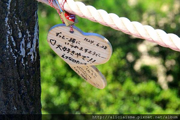 不少戀人特別將心型繪馬寫下心願,掛在彼岸小島上的樹枝梢,