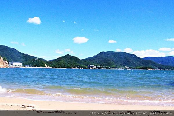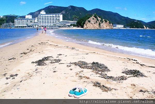 條帶狀的海菜漂浮其間,輕打的白浪在腳邊低語輕和,