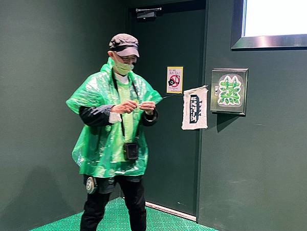 滿是老闆本人在白色牆上手工塗鴉牆背後,披上綠色斗篷雨衣,