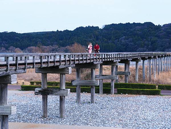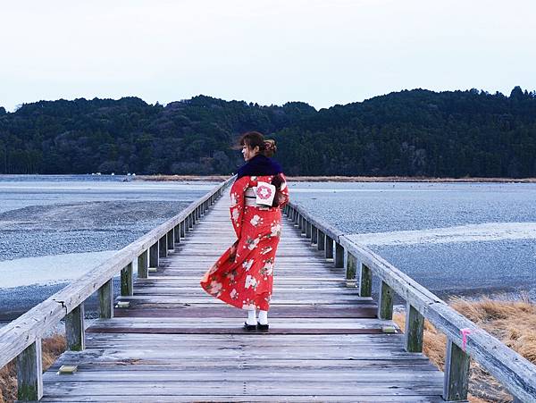著和服,漫步在金氏世界記錄認證的第一長木橋「蓬萊橋」,