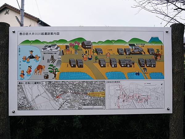 明治時代造橋後,川越文化沒落,河岸邊還有當時人力抬轎渡河的看板,