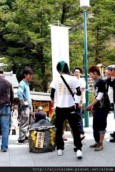據聞繩文時代之遺物「戀愛占卜石(恋占いの石)」可是境內名物,大小成對的戀占石,相距約10公尺,心想或默唸對方之名,閉著眼睛若能從這端走到彼端,戀情便如願以償;走偏了,代表出現波折,穿梭兩石之間的行人則是受阻次數,因此常可看到祈願者與兩旁加油嬉鬧聲同時此起彼落,煞是有趣!