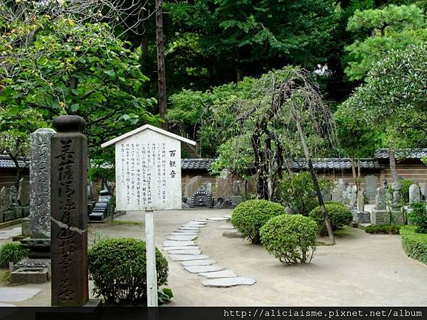 庭中有兩株巨大鎮柏,沿著小徑來到壯觀的「百觀音」,