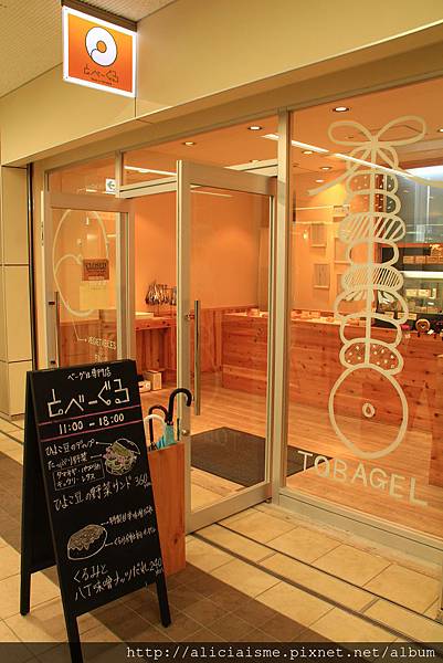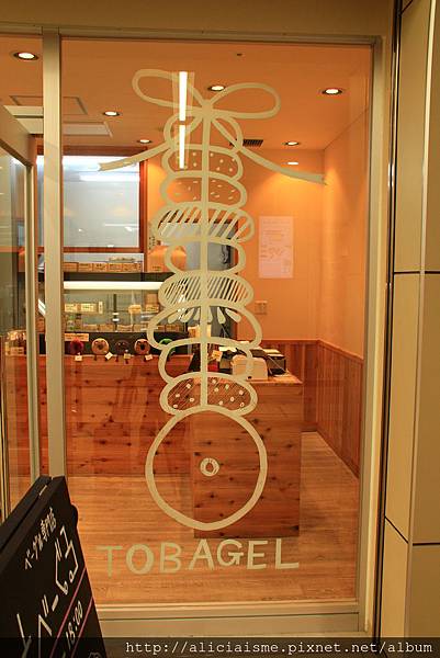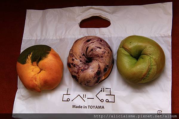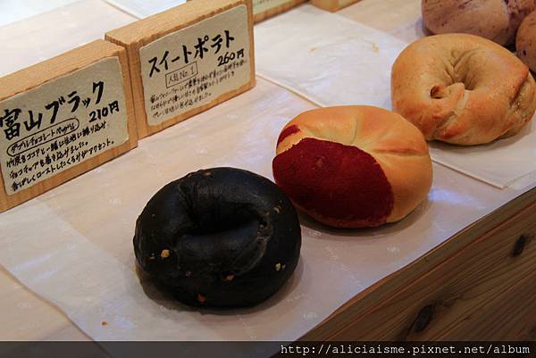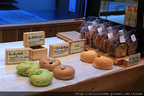 原是因搭乘哆啦A夢列車而來的市區小旅行,回程時因步行整個商店街區,說真的,不知是為了北陸新幹線開業前的準備,還是這城市人口真的太少,周末時間整個商店街沒有幾家店開門外,連步行其中的人都三三兩兩,十分寂寥感。快到車站時繞進地下街,眼前充滿日式咖啡館風格的「Tobagel」馬上吸引到我,進了店才發現這裡沒賣咖啡,也沒有附設用餐區,店內僅賣著貝果一項商品,但數種各式新鮮食材烘焙的貝果正好出爐,也沒想太多,立即跟朋友挑了兩個來品嘗。