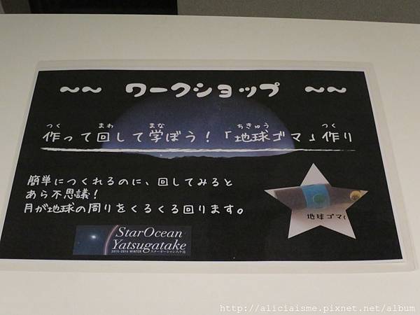 終於來到活動開始,大夥紛紛進到飯店會議室中,除了贈送「星座盤」、可代寄的星空明信片外,桌上已備好一個個黑色管子及文具。原來這是自製「地球陀螺(地球ゴマ)」,利用黃、綠色圓貼紙上,塗以黑色,按壓綠色貼紙處後快速放開,黑管子即將地球運轉以簡單的型式表現出來。