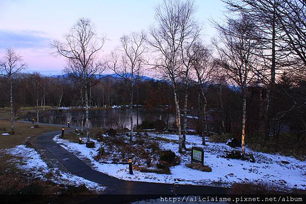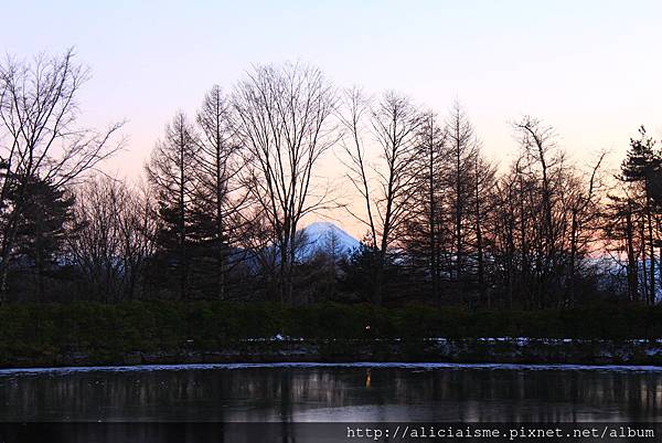 提到來到清里高原飯店,先到後方湖區逛了一下,天氣雖冷,但卻意外在山林後方看到夕陽西下的富士山,帶點白色霧氣的清澄空氣,枯林枝椏將雪妝富士襯托得更具空靈感。