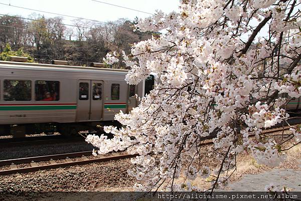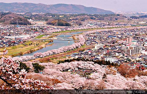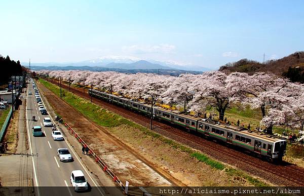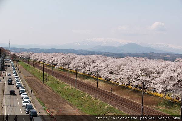 來到柴田千櫻橋,藏王連峰、櫻花、大川與行經的列車,