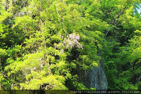 或許接近末船班,大型觀光團皆已離開,只剩獨自前來的零散自助客,更讓這趟行程完全融入在美麗的地景中,一邊讚嘆著大自然的鬼斧神工,一邊悠悠然地享受新綠、清風帶來的通體舒暢,望著水中如鏡的倒影,美哉大自然,不分季節,勿須言語,便已教人好喜歡,何況回程一路上,還有美麗的紫藤花香等著前來迎接我呢!