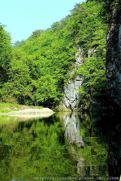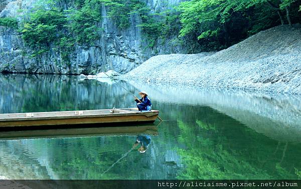 兩岸奇岩巍峨聳立,清風新綠幽谷徐來,水色看似釉綠,卻透澈見溪底,魚兒水中嬉遊,運氣好,聽說這是近來最好日,天晴又無風,水波止,清如鏡,初夏新綠,一抺濃淺有別的綠,層次分別,變化無窮,輕舟沿著夢境般的溪流、山谷間綻放的紫藤,心中那座桃花源,慢慢在眼前展開。