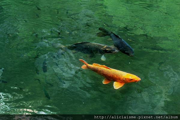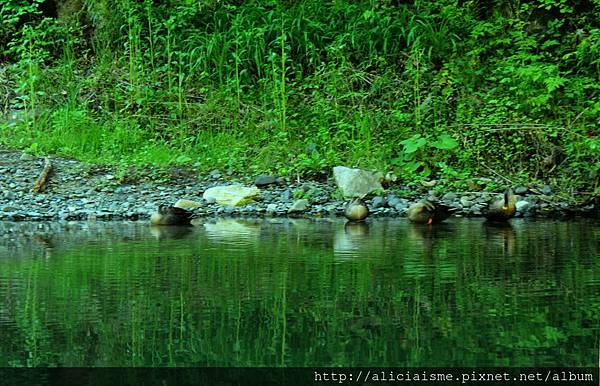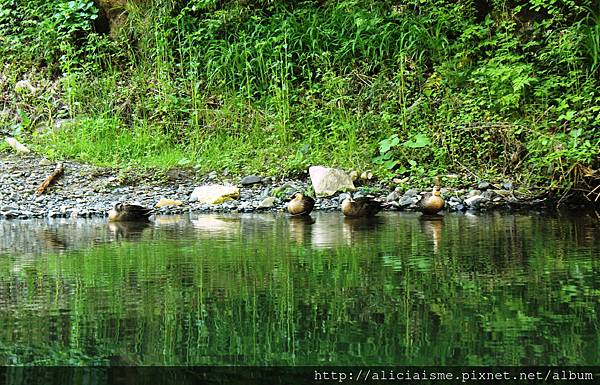 意外的是,看來帶些混濁綠的溪水,這才發現其實相當清澈,女船夫也不時丟些誘餌,引來溪中香魚、錦鯉、水鴨也跟著群聚在舟船側,大家也驚呼連連。