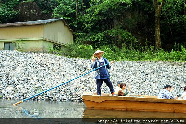 除了冬季(11月下旬~隔年3月底)提供有暖爐的屋形船,其他季節來訪則是沒有遮蔽篷的平船,讓人徜徉在大自然中,沒有隔閡。雖然在日本也有不少地方以舟船來觀光遊溪河,但聽船夫說明才知這可是日本目前唯一手划式(手漕ぎ)的舟船,只見船夫以長木槳撐著溪底,以手划方式讓船前行的觀光船,光想都累,何況我搭的還是一位女船夫。