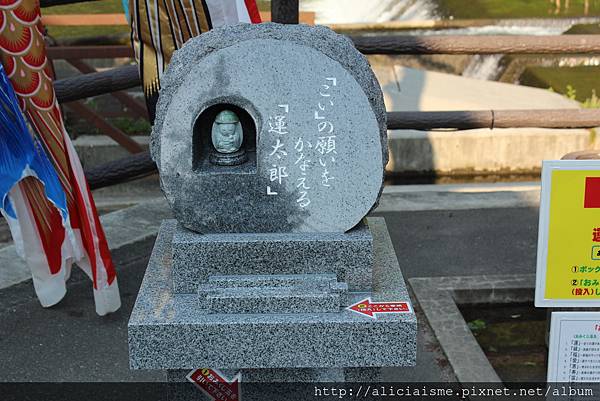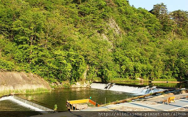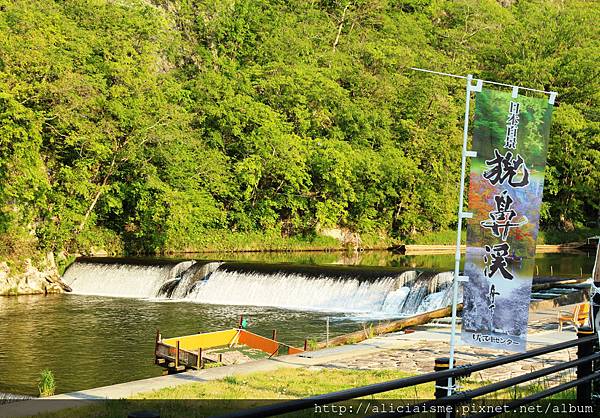 剛來訪時,船正要開,急忙買票上船,回頭才想起原來搭乘處前方的堰堤瀑布,正是「龍門瀑布」,因位於溪流入口處,加上猊鼻溪彎曲如龍形而得名,每年秋天自太平洋迴游的鮭魚群聚於此,在瀑水前競相跳躍瀑布入溪谷,如「鯉魚跳龍門」,因此為祈求未來小朋友們成龍成鳳,每年5月的日本兒童節前後,便高掛鯉魚旗,而我來訪時雖已過了黃金周,但旗幟依舊飄洋在空中,讓這一抺初夏新綠更添來繽紛。