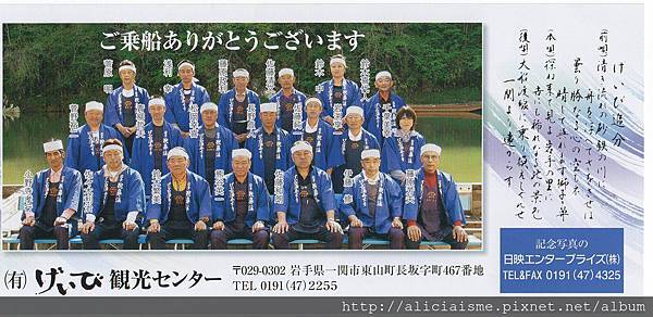 她笑說傳自她祖母教她的古老民謠,讓她從小就能跟著哼唱,還開玩笑說,因知道很多船夫前輩都能言善道,但她相對較安靜,但看到大家的熱情,決定再高歌一曲傳統民謠送給大家。而且經她一提點,才發現原來手上的船票背面,印著便是所有船夫們的照片,這時大家也才恍然大悟,原來我們如此幸運,搭上唯一女船夫的平舟呢!(第二排最右者)