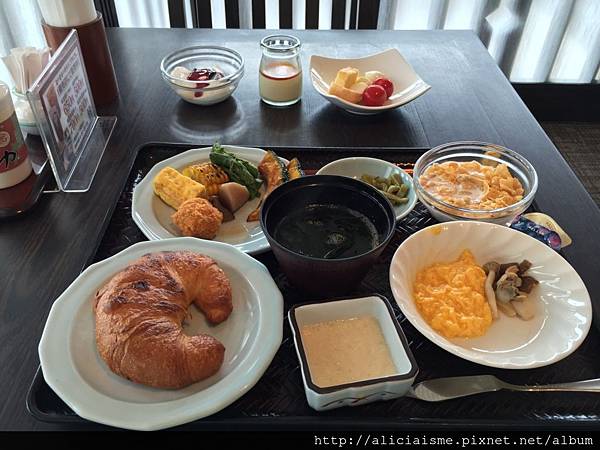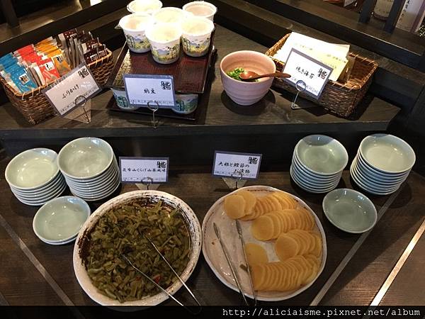 前一天在溫泉處已見識到住宿飯店人潮之多,光是淋浴就得等上一輪,這回早餐更是史無前例的誇張,坐電梯一到用餐的2樓處,才7點鐘,一圈圈的人潮已排到電梯口。遇到同行者是6:30前來排隊,也大致相同,沒有等上近一個小時,很難用到餐,所以熱門旺季前來時,可能也要有心理準備。
