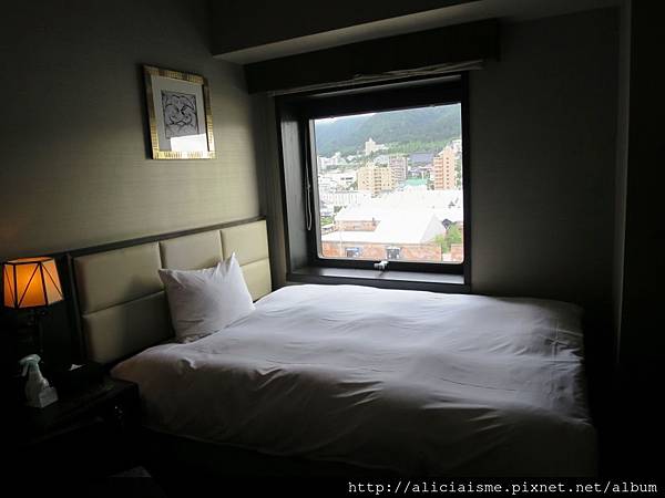 就房間而言,延續大廳的古典懷舊風格,房間也類似,但看得出年代有些久遠,所以房間拉門、櫥櫃或桌椅部分都有些歷史,因我住宿的是面向函館山單人房(費用較面函館車站的貴一些),或許地點好,所以房間空間其實很小,有些像商務旅館的配置,連窗口都是緊貼著床。倒是窗口正好面對倉庫群,遠眺函館山,視野上讓人極為舒暢。