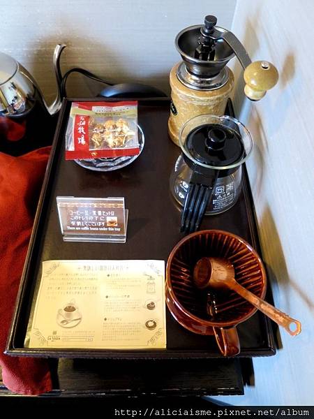 到底是以療癒之湯聞名,飯店貼心準備好溫泉籃及兩套可供在飯店公共空間穿著休閒服及睡覺用的睡袍供使用外,我最喜歡其全套的手沖咖啡設備,從咖啡豆、手搖磨豆機、沖泡壺等,另附贈北海道著名的「花畑牧場」獨家合作的點心,即便獨享,倒是讓夜晚格外放鬆。
