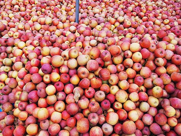 整地的紅蘋果,好像蘋果大富翁,坐擁滿滿的蘋果山。這裡的農園多半是人工選果,