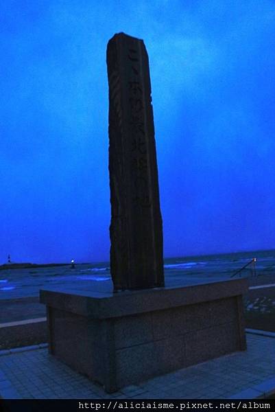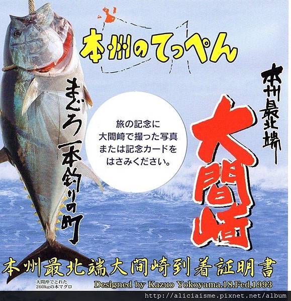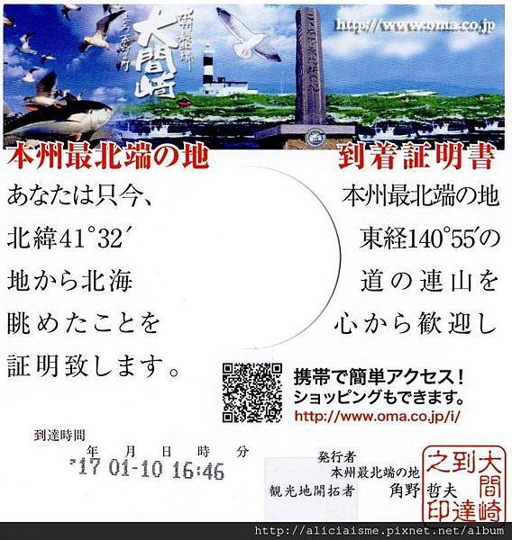 於是,寒冬天黑得快,又遇上今年冬天最冷寒流來襲,大雪紛飛天色已昏暗,石碑上的文字難以入鏡,但還是很開心來到本州最北端的「大間崎」,還在大間觀光土產中心領買一張記念證書。