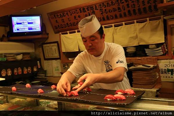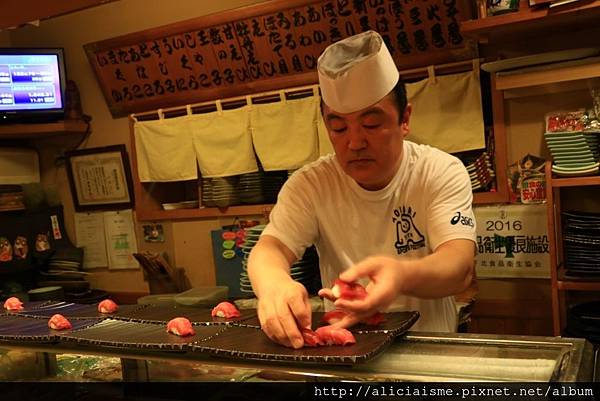內店全部提供津輕海峽內所捕獲的大間黑鮪魚,有多種MENU供選擇,包括丼飯、壽司等,都是採用嚴選超過100公斤以上的高級黑鮪魚肉為主,而我們點的是嚐鮮版的三貫極品壽司(依序為中トロ、赤身、大トロ)。