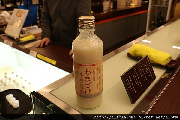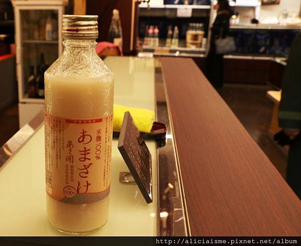日本甘酒雖名為「酒」,實為無酒精飲品,是一種以白米或圓糯米煮成粥狀,拌上米麴再發酵而成,與台灣甜酒釀有一點點類似的作法,差別是後者是以酒麴發酵,所以食用時是有酒味,而日本甘酒則採米麴,所以喝來的口感像是發酵後的甜味,甜滋滋的溫潤感,但實則完全沒有使到在糖,冷飲、熱飲皆宜,而且有益身體,被譽為「喝的點滴」。可惜的是這款甘酒因得冷藏,帶不走之下,只能試飲乾過癮。