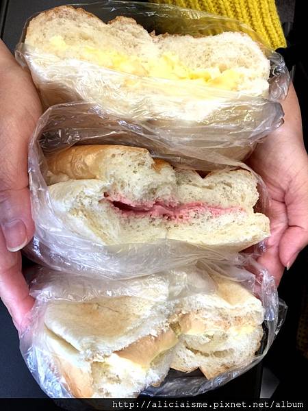 切成兩半的麵包中間,兩邊各夾以奶油及另一種果醬,奇妙的是合而為一後,奶油果醬居然如此搭,我們再挑了三種~草莓、顆粒花生、青森蘋果。最讓我驚艷的應是草莓,現做的居然跟包裝口感差很多,包裝的很像台灣便利商店的果醬,但是現塗的,不知是果醬不同,或是融合奶油後不一樣,柔順滑潤的口感,雖然吃來有點肥的罪惡感,但真是口齒留香。