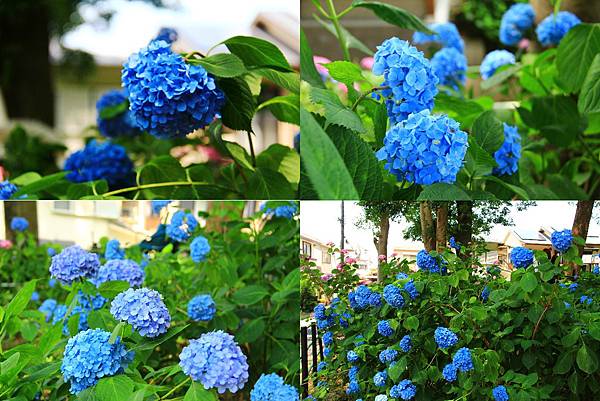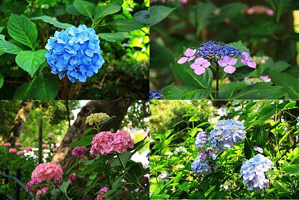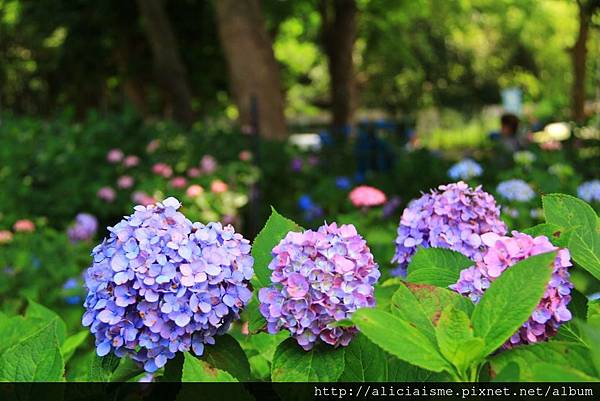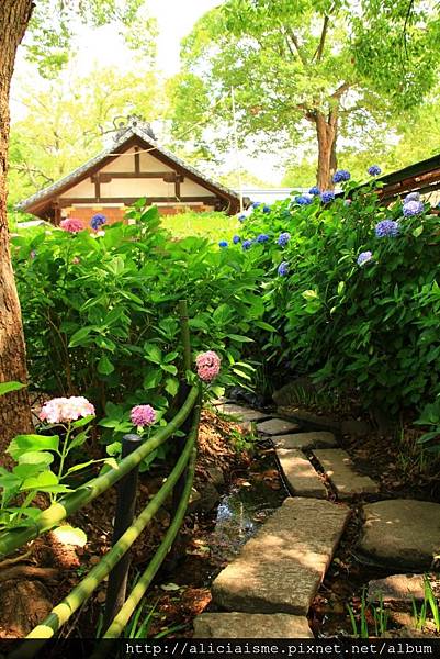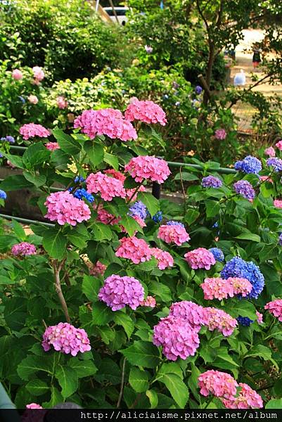 花苑裡窄而彎曲的石徑道上,兩邊種滿多彩繽紛的紫陽花,