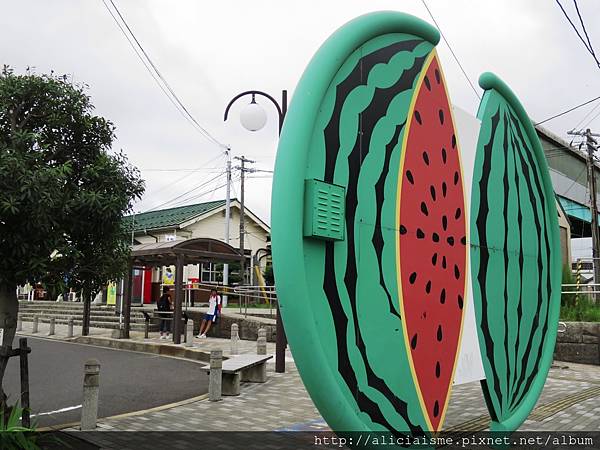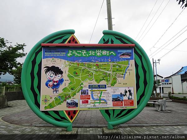 站前廣場上,結合北榮町當地盛產的西瓜看格,柯南的銅像、列車看板,加上剛設的大型彩色柯南,招牌姿勢讓人不禁莞爾一笑。