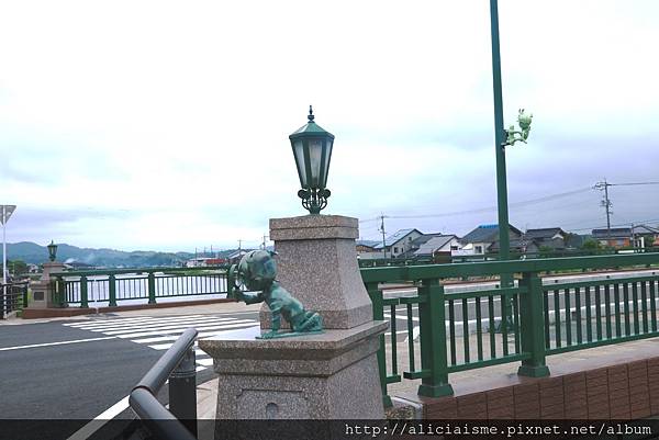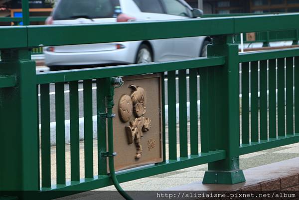 沿著這條大道,行經柯南大橋, 全長約69公尺的大橋,走路不到3分鐘,但從路燈、橋頭休息椅、橋身兩端、欄杆等,處處都有柯南的雕塑或銅刻繪,而低頭一瞧,連下水道孔都採用柯南圖案,不想錯過的可先參考青山剛昌故鄉館官網的介紹。
