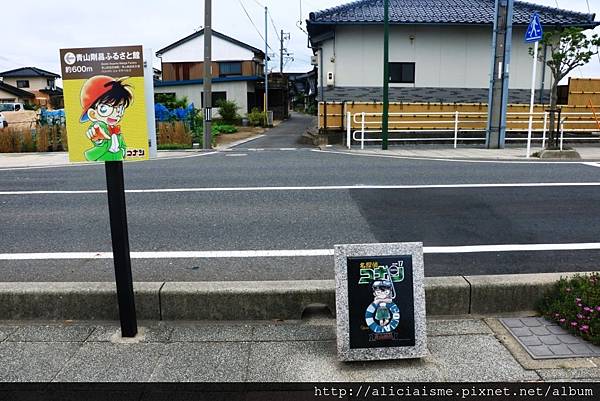 原本還有覺得有些路程,只要跟著指標、沿著〔柯南大道〕的石書,即各集漫畫的封面,從車站開始的第23集,中途意外來到青山先生父親經營的汽車行,待走到第1集時,青山剛昌故鄉館便到了。