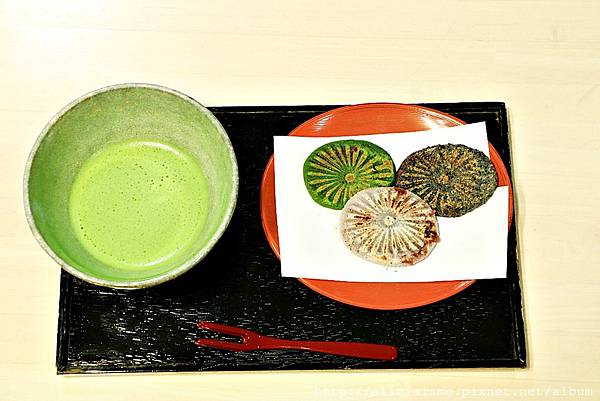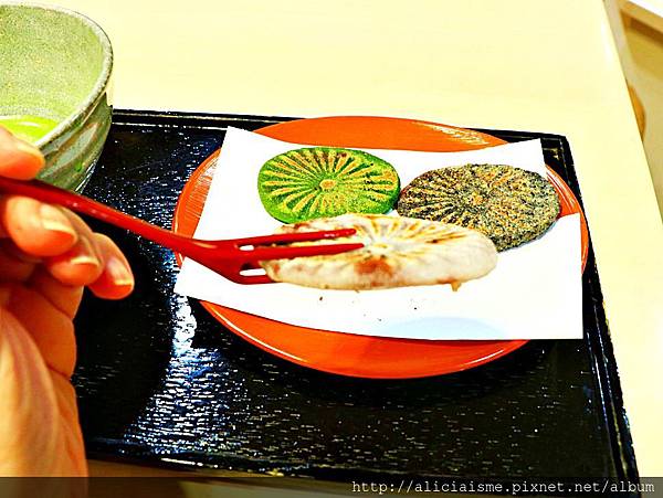 仔細一瞧,連叉子都是經過特殊設計,可剛好夾麻糬的薄度可輕鬆入口,讓人好驚訝歷史老店原來細節可比現代新店還貼心,坐在茶屋紅布坐椅上,搭配熱抹茶,望著海報上的瀑布,下回一定要來瀑布前欣賞一下美味。
