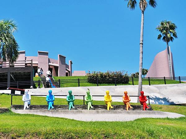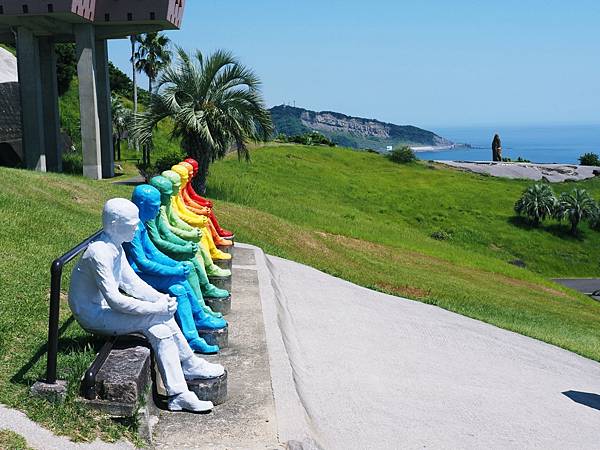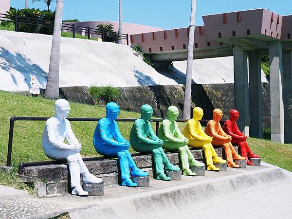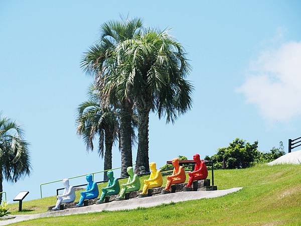 戀人之丘一旁則是7尊排排坐的虹色人物一字排開,