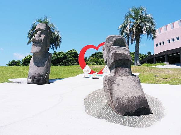 「戀人之丘」設有兩尊《最愛》摩艾,搭配後方紅心,是戀人們最熱愛的合影景點。