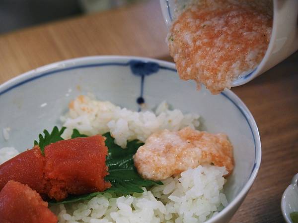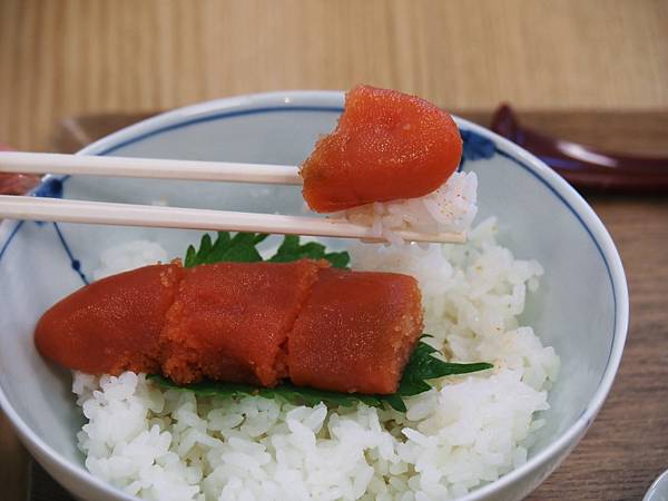 熱騰騰的白飯上,大方放上整條切段的鹹香明太子