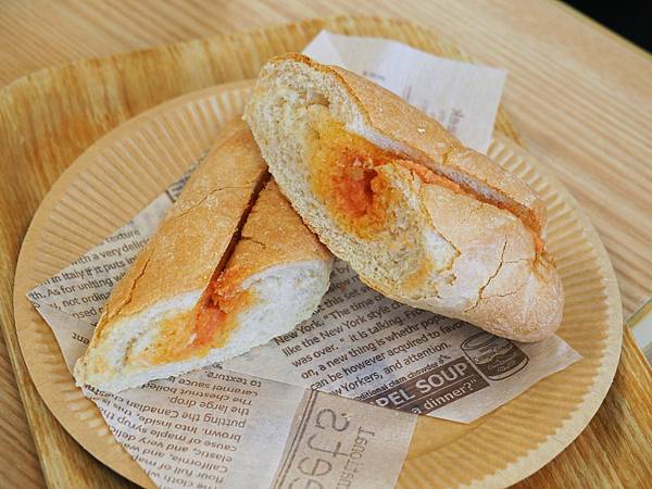 香酥的麵包體上塗抺厚厚的明太子醬,