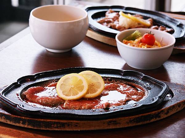 經典檸檬牛排,是將牛肉片放在鐵板上料理後,趁著肉還鮮嫩端上桌。