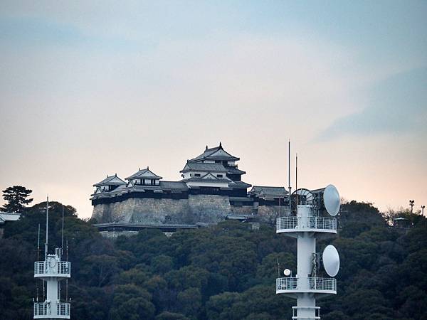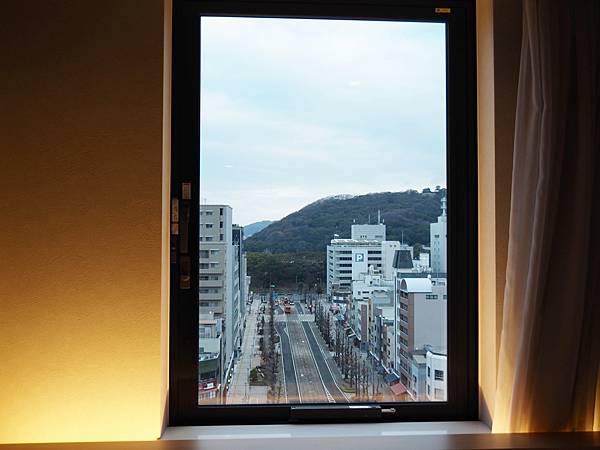 一開窗,上方眺望松山城,眼下松山市電正穿梭在街頭。