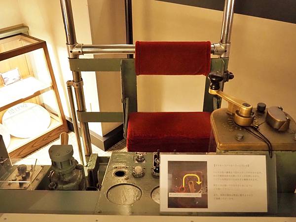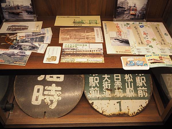 置放來自伊予鐵道的老車牌,房內擺放著電車座椅、扶手環等。