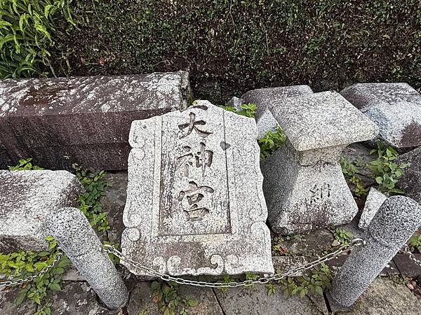 陽光透過樹影灑在佇立的一柱鳥居與斷裂的狛犬上,