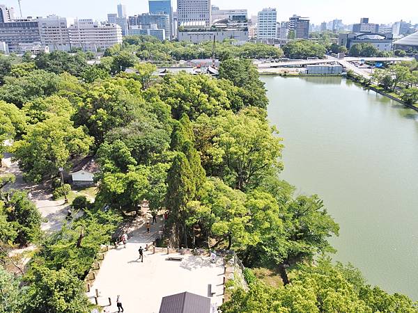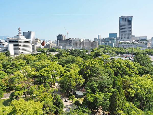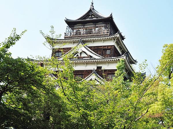 黑瓦白牆的天守閣在一片綠意中特別鮮明。