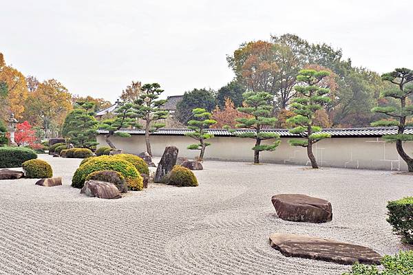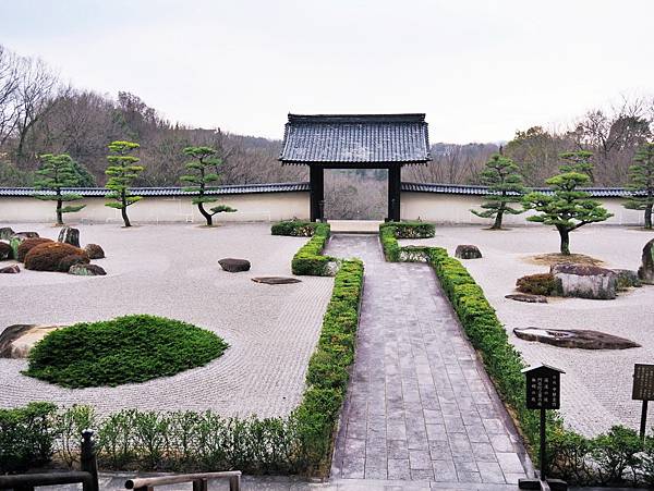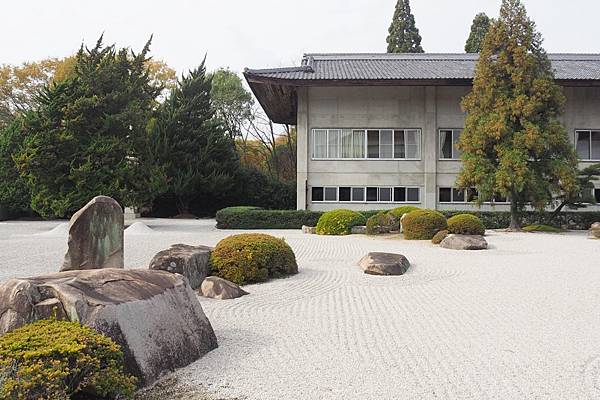 白砂鋪展,石組如山,水流的意象以紋路描繪,各自象徵佛教教義中的不同境界。