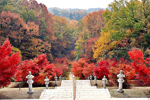 兩側大階梯旁種滿楓葉,紅通通的色彩讓爬坡也浪漫。