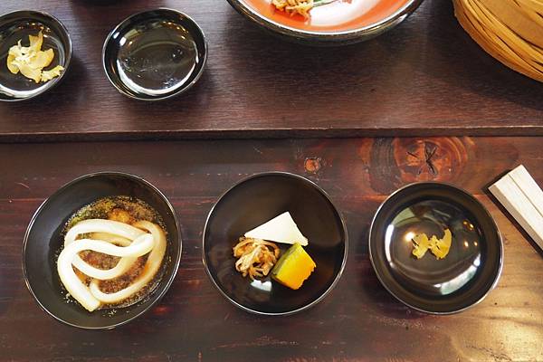 用餐時,三個黑碗,依大中小分別盛上烏龍、配菜與漬物;